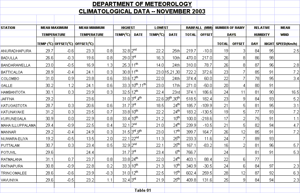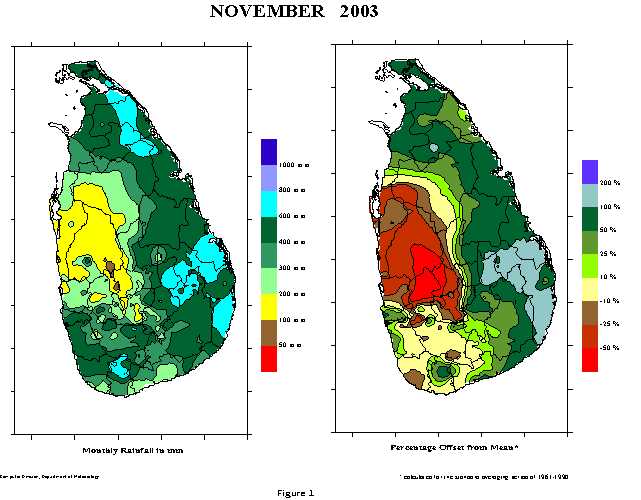 Temperature: Average maximum temperatures were about normal except at Galle where it was little above normal. Average minimum temperatures were little above normal at Bandarawela, Nuwara Eliya and Vavuniya and about normal elsewhere. The highest temperature recorded during the month was 33.8 oC at Katunayaka on the 10th and at Ratmalana on the 24th. The lowest recorded at a coastal station was 22.1 oC at Puttalam on the 25th while that for the whole island was 11.3 oC at Nuwara Eliya on 25th.